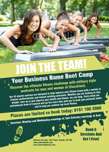 ‘Boot camp’ sessions have connotations of being held outdoors, where clients engage in group military-style training. Having a colour pallet and design which reflects the class is very fitting, and can greatly enhance any personal training leaflet.